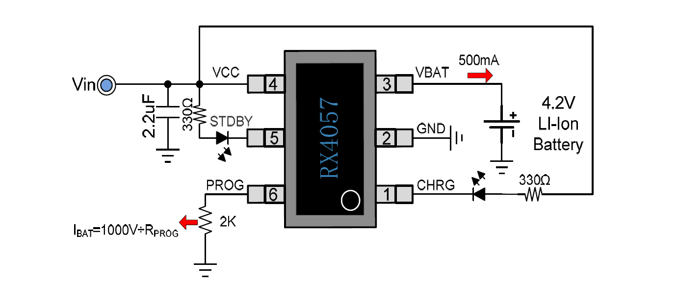 RX4057充電截止電壓為4.2V,充電電流可通過