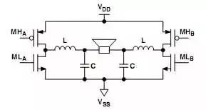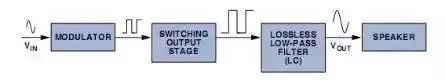 由于大多數(shù)音頻信號(hào)不是脈沖串,因此必須包括一個(gè)調(diào)制器將音頻輸入轉(zhuǎn)換為脈沖信號(hào)。脈沖的頻率成分包括需要的音頻信號(hào)和與調(diào)制過程相關(guān)的重要的高頻能量。經(jīng)常在輸出級(jí)和揚(yáng)聲器之間插入一個(gè)低通濾波器以將電磁干擾(EMI)減至最小,并且避免以太多的高頻能量驅(qū)動(dòng)揚(yáng)聲器。為了保持開關(guān)輸出級(jí)的功耗優(yōu)點(diǎn),要求該濾波器(見圖3)是無損的(或接近于無損)。低通濾波器通常采用電容器和電感器,只有揚(yáng)聲器是耗能元件。