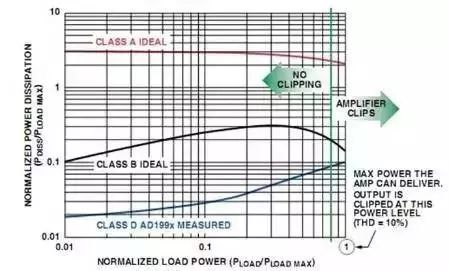 功耗和功率效率的差異在中等功率水平處很大。這對(duì)于音頻很重要,因?yàn)榇笠袅恳魳返拈L(zhǎng)期平均功率水平要比達(dá)到PLOAD max的瞬時(shí)峰值水平低很多(為其1/5到1/20,取決于音樂類型)。因而,對(duì)于音頻放大器,[PLOAD = 0.1×PLOAD max] 是一個(gè)合理的平均功率水平,按照這個(gè)功率水平評(píng)估PDISS。在這個(gè)功率水平,D類放大器輸出級(jí)的功耗是B類放大器的1/9,是A類放大器的1/107。