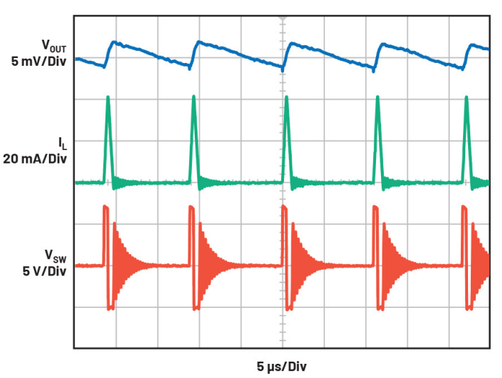圖3. 處于脈沖跳頻模式下的 LT3573 ,負載很低。