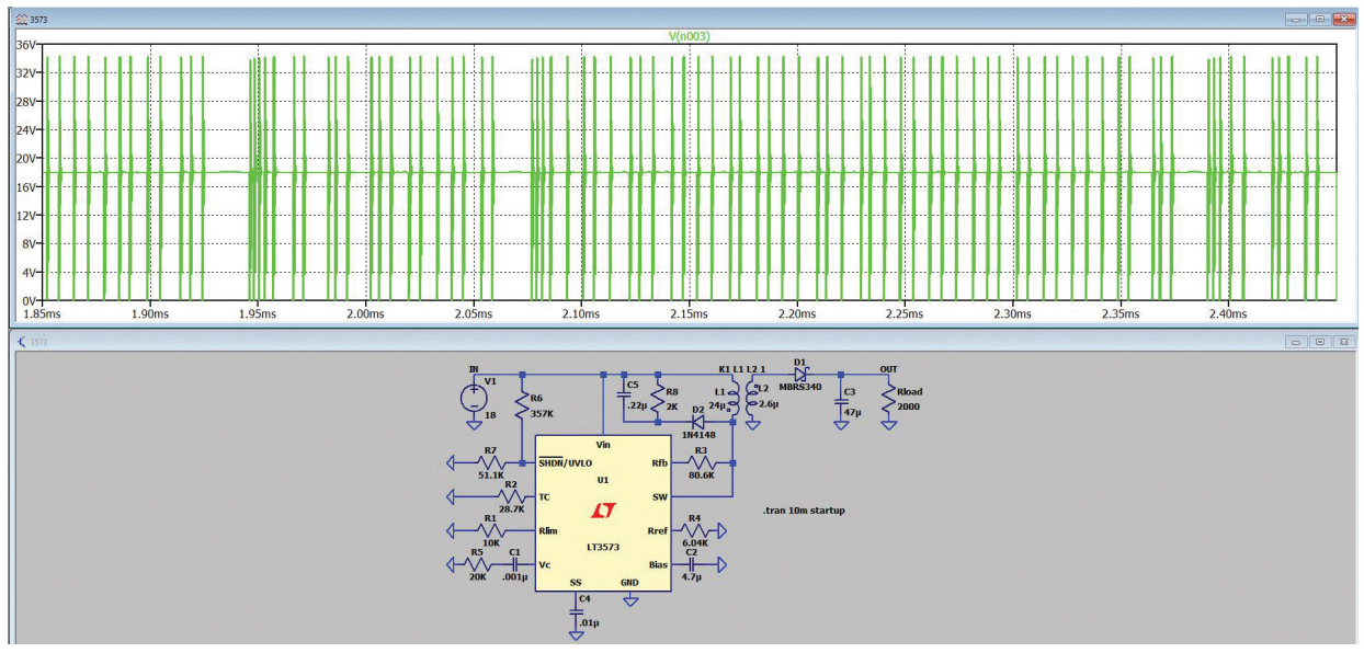 圖2. 使用LTspice®,仿真處于突發(fā)模式下的 LT8620 降壓型開關穩(wěn)壓器。