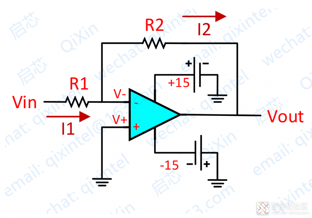 因為虛斷,反向輸入端沒有電流輸入輸出,通過 R1 和 R2 的電流相等,設(shè)此電流為 I