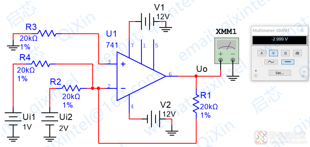 下面是R2=R4 R1=3*R2的情況,可以看到結(jié)果也是符合我們預(yù)期的,即VO=3*(V1+V2),仿真圖例如下