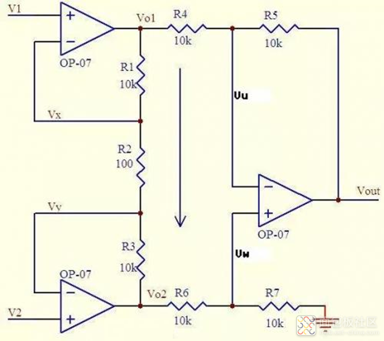 則:Vo1-Vo2=I*(R1+R2+R3) = (Vx-Vy)(R1+R2+R3)/R2