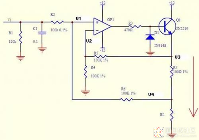 上式說明 R7 兩端的電壓和輸入電壓 Vi 相等,則通過 R7 的電流 I=Vi/R7,如果負載 RL<<100KΩ,則通過 Rl 和通過 R7 的電流基本相同。