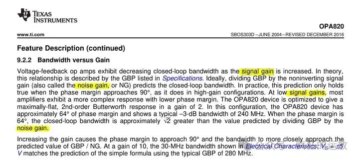 Signal gain(信號(hào)增益)與Noise gain(噪聲增益),屬于運(yùn)放閉環(huán)的屬性,由外部電路決定,所以不在運(yùn)放的數(shù)據(jù)表中,但在spec中又經(jīng)常出現(xiàn),特別是對(duì)于那些強(qiáng)調(diào)小信號(hào)、信噪比的運(yùn)放,比如在OPA820中就有如下描述: