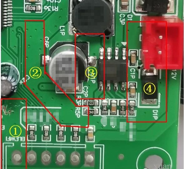 還有一些受制于結(jié)構(gòu)導(dǎo)致的,某一個(gè)模塊本應(yīng)完整的GND,被其他走線分割成多個(gè)區(qū)域的跨步GND。例如下圖的PCB電路所示,電源輸入的負(fù)極接上PCB板后直接變成“GND”也就是①位置,往電源模塊過去的方向上,①與②之間被信號線隔斷;②與③之間被5V輸出隔斷;而③與④之間被芯片的使能隔斷。這樣布局的GND雖然用萬用表上測量是連通的,但是從原理圖上的走線先后順序,以及高頻狀態(tài)下的“地阻抗”來說都是不合理的。尤其是電源這個(gè)模塊作為EMC問題的核心之一,地的布局一定要在同一層是完整的!