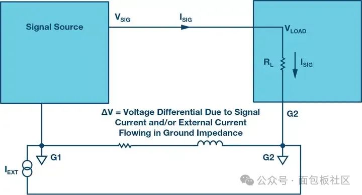 圖1b. 接地阻抗中流動(dòng)的信號(hào)和/或外部電流產(chǎn)生誤差電壓ΔV