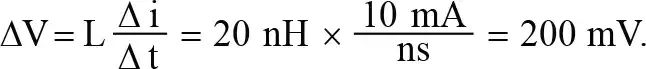 mΩ/英寸的電阻。由邏輯信號(hào)轉(zhuǎn)換產(chǎn)生的壓擺率為10 mA/ns的瞬態(tài)電流,在此頻率下流經(jīng)1英寸的該導(dǎo)線,將形成200 mV的無(wú)用壓降: