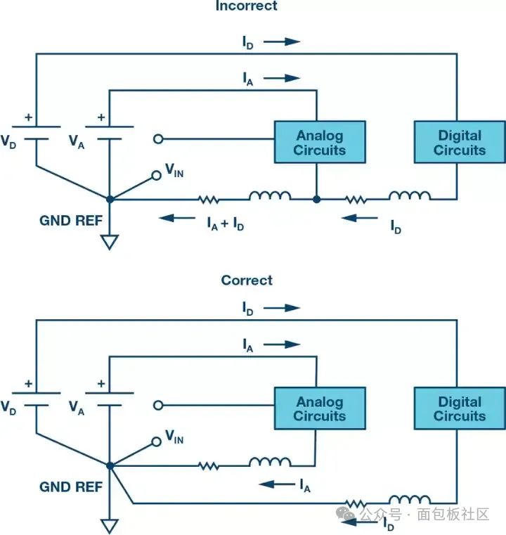 μV誤差約等于16位精度水平的3.3 LSB誤差。圖3顯示了模擬接地回路中流動(dòng)的高噪聲數(shù)字電流如何在輸入模擬電路的電壓VIN中產(chǎn)生誤差。將模擬電路地和數(shù)字電路地連接在同一點(diǎn)(如下方的正確電路圖所示),可以在某種程度上緩解上述問(wèn)題。