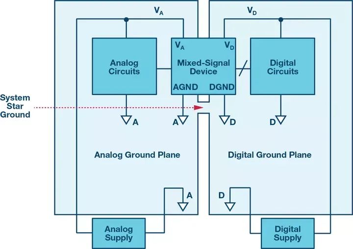 模擬電路和數(shù)字電路在物理上相隔離,分別位于各自的接地層上?;旌闲盘?hào)器件橫跨兩個(gè)接地層,系統(tǒng)單點(diǎn)或星形接地是兩個(gè)接地層的連接點(diǎn)。