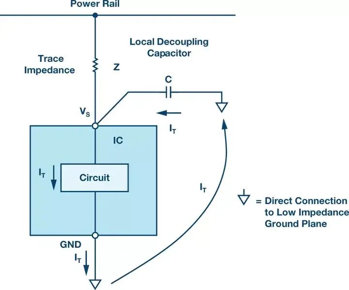 通過(guò)使用盡可能短的連接,將適當(dāng)類(lèi)型的局部去耦電容直接連接到電源引腳和接地層之間,可以較大限度地降低對(duì)功率噪聲和紋波的靈敏度。去耦電容用作瞬態(tài)電流的電荷庫(kù),并將其直接分流到地,從而在IC上保持恒定的電源電壓。雖然回路電流路徑通過(guò)接地層,但由于接地層阻抗較低,回路電流一般不會(huì)產(chǎn)生明顯的誤差電壓。