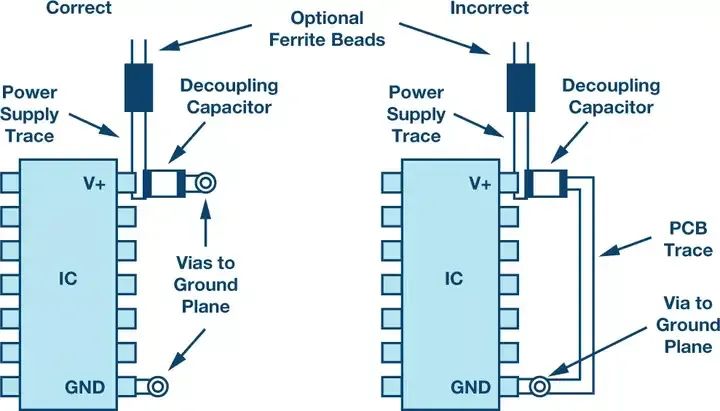 圖7. 高頻去耦電容的正確和錯(cuò)誤放置