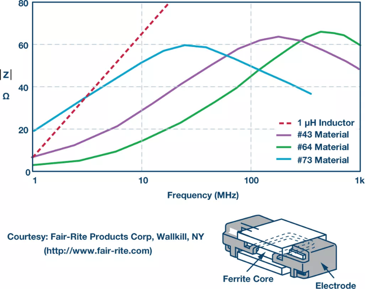 鐵氧體磁珠(以鎳、鋅、錳的氧化物或其他化合物制造的絕緣陶瓷)也可用于在電源濾波器中去耦。鐵氧體在低頻下(<100kHz)為感性—因此對(duì)低通LC去耦濾波器有用。100kHz以上,鐵氧體成阻性(低Q)。鐵氧體阻抗與材料、工作頻率范圍、直流偏置電流、匝數(shù)、尺寸、形狀和溫度成函數(shù)關(guān)系。