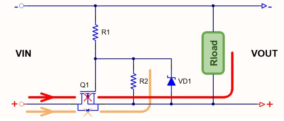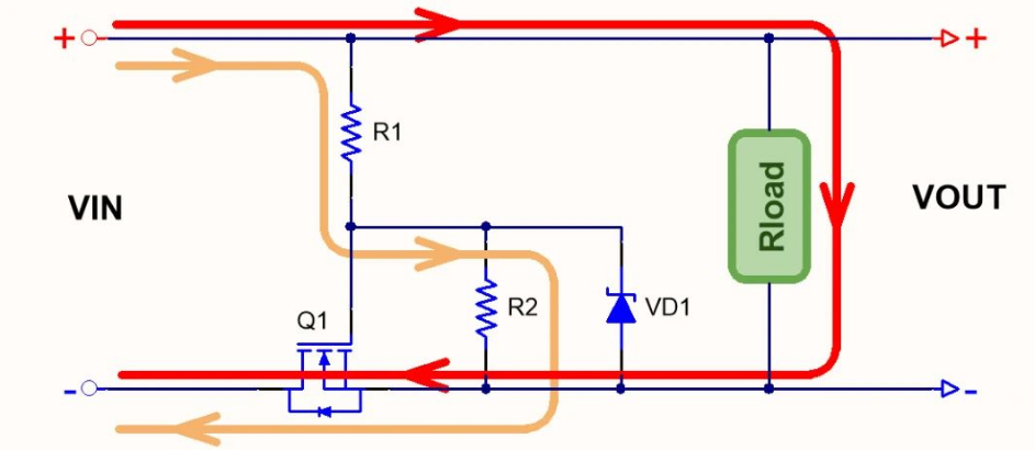 當(dāng)輸入上正下負(fù)時(shí),下圖黃色線條所示電流路徑,經(jīng)過(guò)R1、R2,MOS寄生二極管到地,R1與R2分壓后其GS極電壓大于MOS導(dǎo)通電壓Vgs,MOS導(dǎo)通,紅色線條所示的整個(gè)電路回路接通。