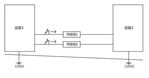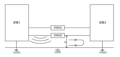 第二種:設(shè)備1和設(shè)備2的接地點GND1和GND2電位不相同,導(dǎo)致實際的兩個設(shè)備之間存在壓差,從而產(chǎn)生感應(yīng)電流在兩根傳輸線上傳播,如圖3所示: