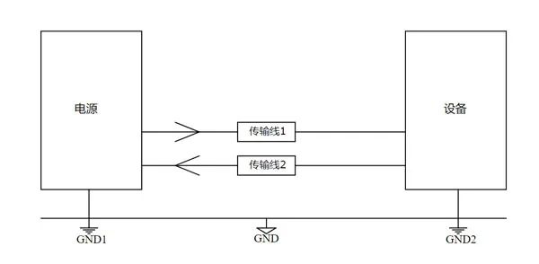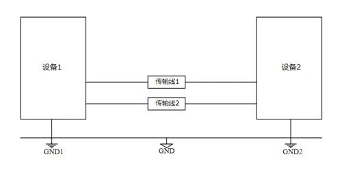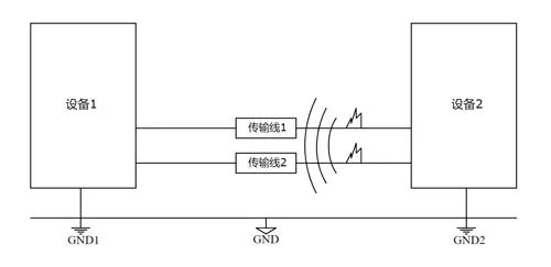 共模干擾是兩個幅度相同,相位相同的信號。在兩個設(shè)備之間傳輸電源或者信號的傳輸線至少有兩根,如圖1所示: