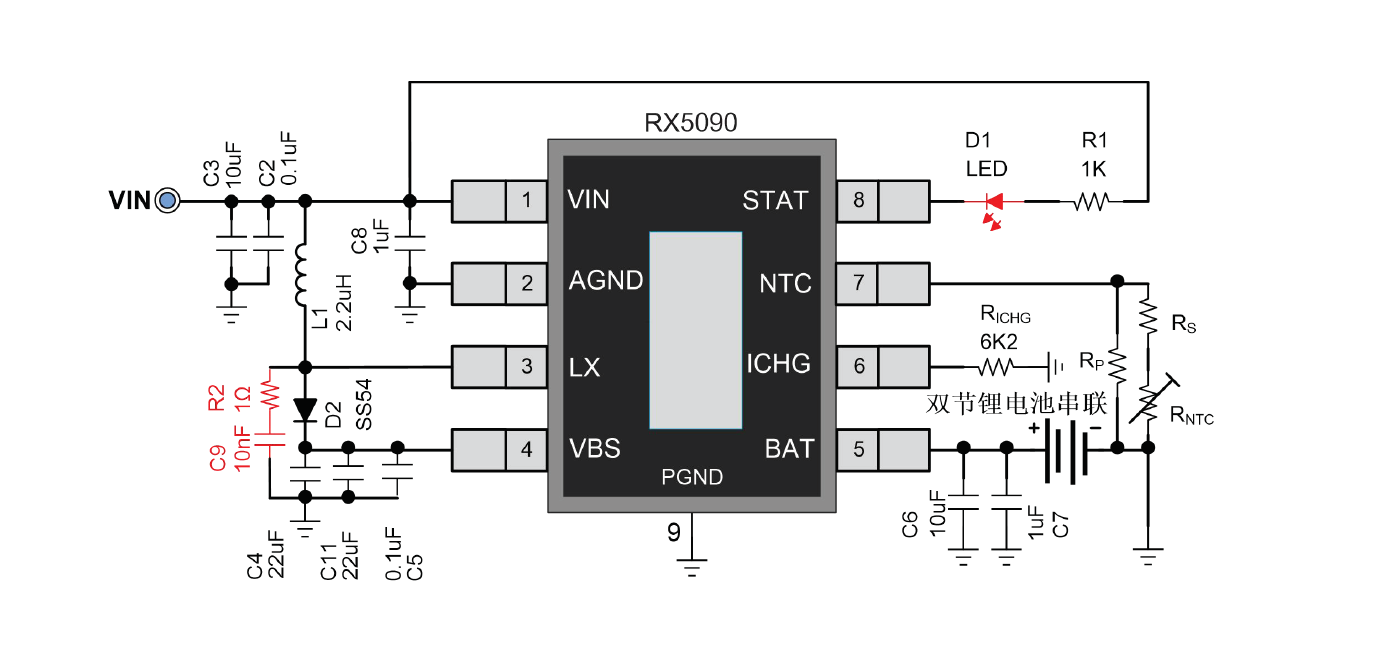 RX5090 是一款5V USB 輸入,最大1.6A 充電電流,